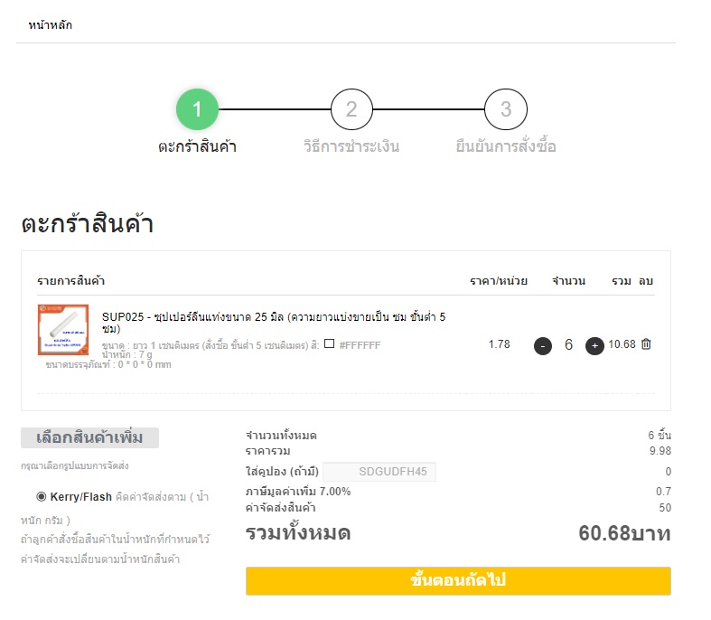 1.เข้าไปที่ shop ของชนิดสินค้า 2. เลือกสินค้า แล้วใส่ความยาวที่ต้องการที่ช่องจำนวน 3. กดเลือกสินค้า เข้า ตะกร้า 4. เมือ เลือกสินค้าเสร็จแล้วกดเข้าหน้าตะกร้าสินค้า ดูยอดชำระเงิน แล้วกดขึ้นตอนต่อไป |